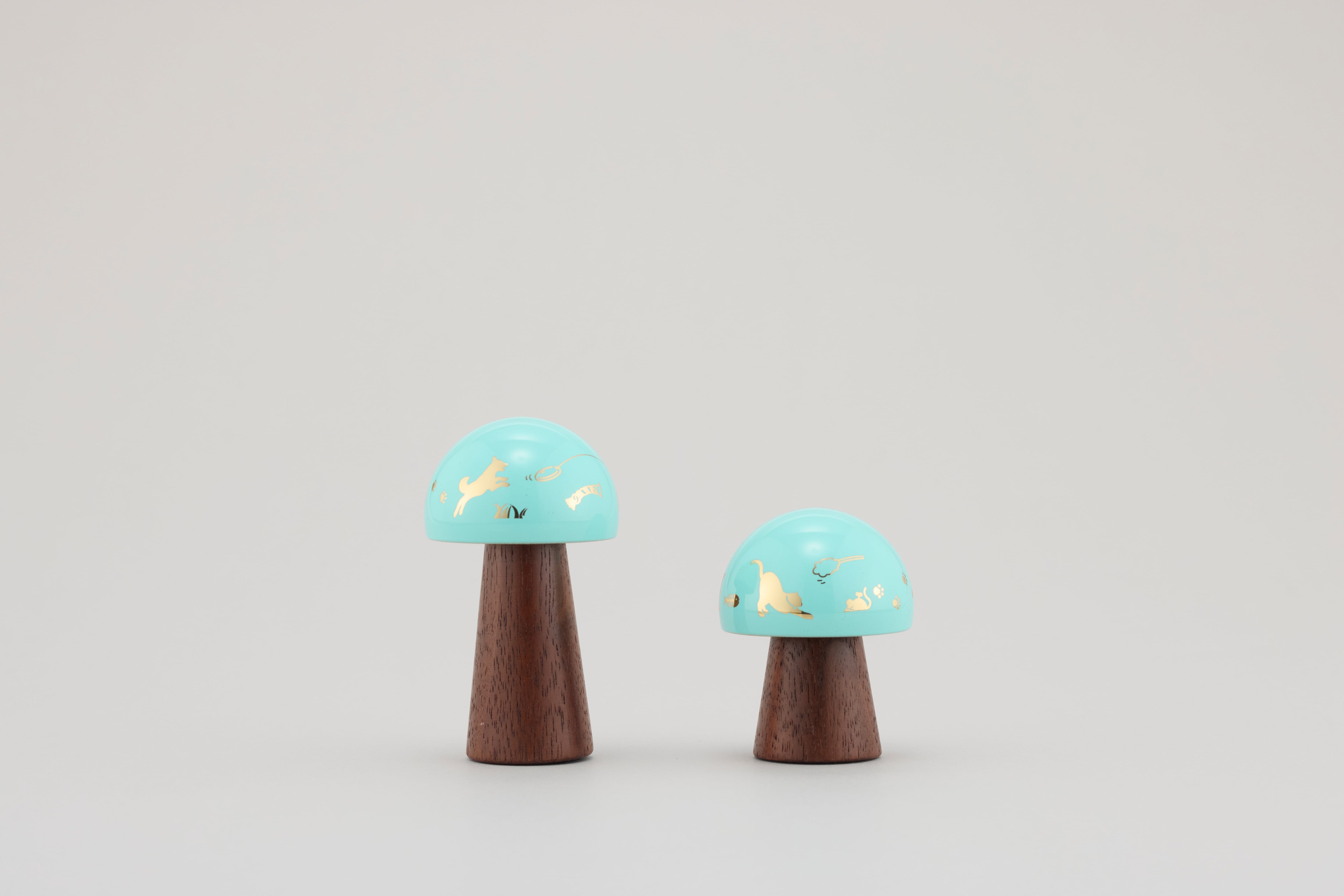 りん部を揺らすことで木部ベースに接触して音が鳴る、シンプルな構造のおりん。そのフォルムはさながらキノコのよう。りん部は木部ベース先端に接地されたピンを支点として釣鐘式に設置されており、触れるとゆらゆら、可愛らしい動きを見せてくれます。りん部分とそれを支えるピンの接触面が非常に小さいため、音の振動が妨げられることなく、小さなりんでも澄んだ心地よい音色を長く楽しむことができます。木部ベースの底部には転倒防止のため重りを埋め込んでいます。